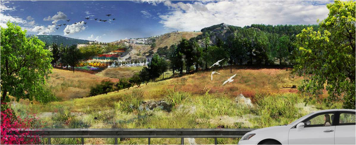 Our wish is to highlight the existing beauty of the place rather than changing it into a newtopia. Our wish is also to get the most result for the budget, by using existing materials and forms to the degree possible. Reuse is a key strategy. Local rubble is a key material. It is laid out along the floor of a ravine to indicate safe passage through difficulty, it is arranged in mounds to make habitable landmarks on the otherwise plain plateaus, it is placed in gabions to create rhythm next to the highway.