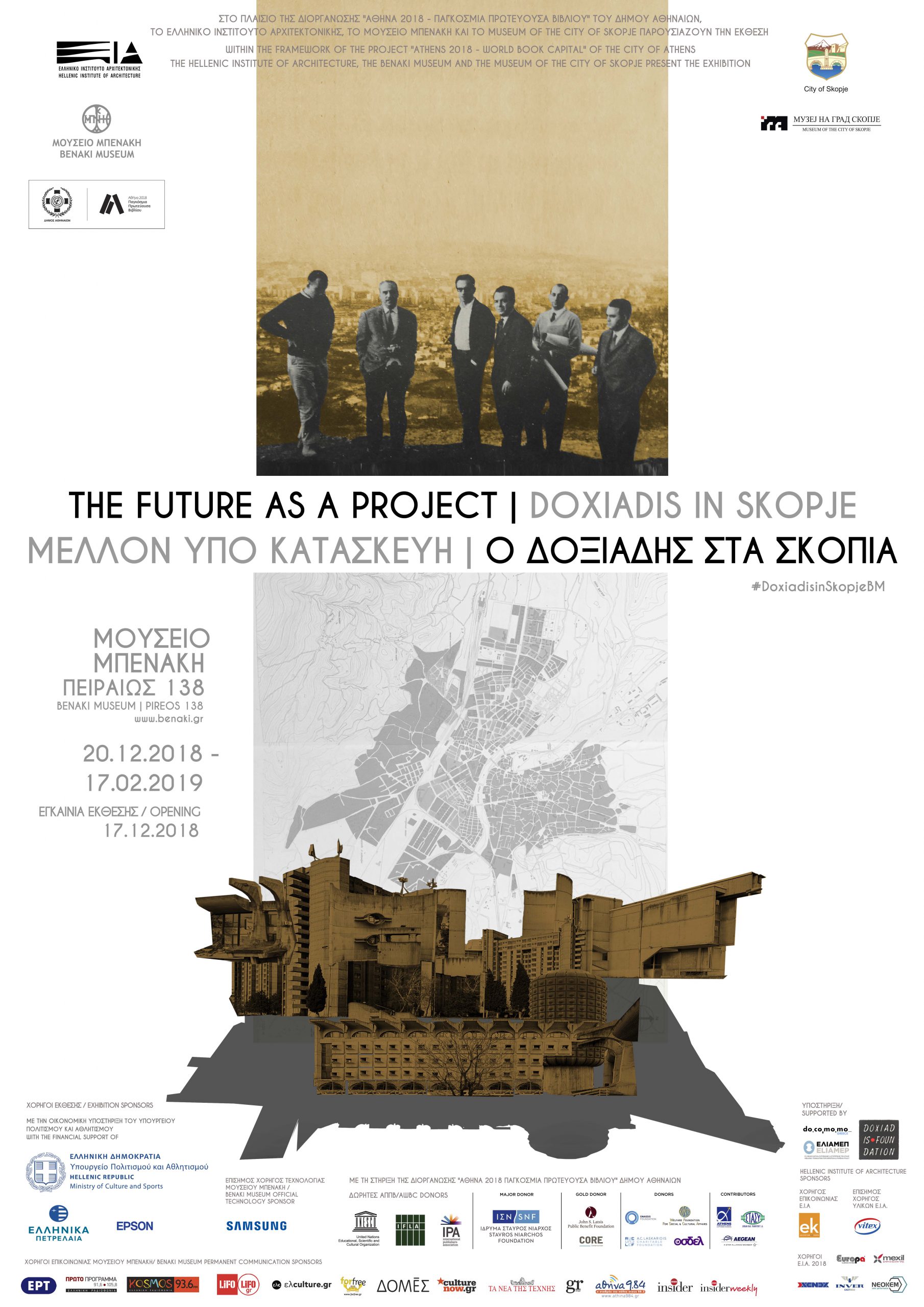 Both the exhibition and its accompanying events are organised by the Hellenic Institute of Architecture and the Museum of the city of Skopje within the framework of ‘Athens 2018-World Book Capital’ by the City of Athens, with the financial support of the Ministry of Culture and Sports. The exhibition material has been contributed by the Museum of Skopje, the personal collection of Jovan Ivanovski, Ana Ivanovska and Vladimir Deskov and the C.A.Doxiadis Archives of the Constantinos and Emma Doxiadis Foundation.